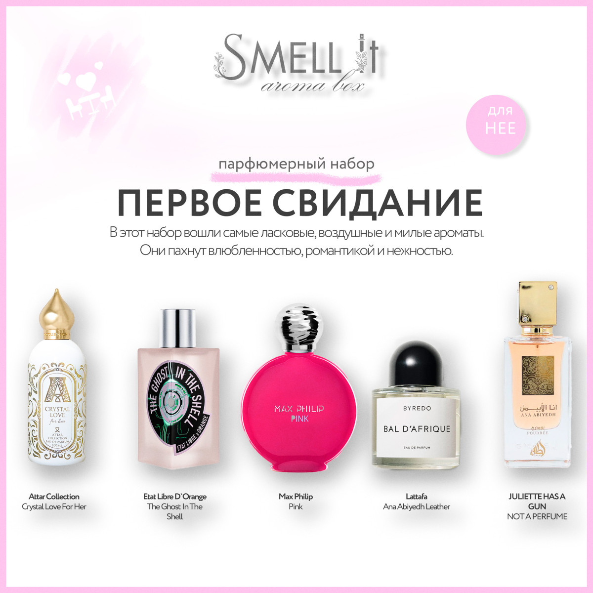 Ваше первое свидание может стать началом чего-то волшебного, и каждая деталь важна. Аромабокс "Первое Свидание" создан, чтобы добавить этому особенному моменту еще больше очарования и уверенности. Эксклюзивный Набор - В аромабокс входят 5 тщательно подобранных парфюмов, которые помогут создать незабываемую атмосферу и оставят запоминающийся шлейф. Не оставляйте ничего на волю случая в такой важный момент, как первое свидание. Позвольте аромабоксу "Первое Свидание" стать вашим тайным союзником. Заказывайте сейчас и погружайтесь в мир романтики и притяжения!