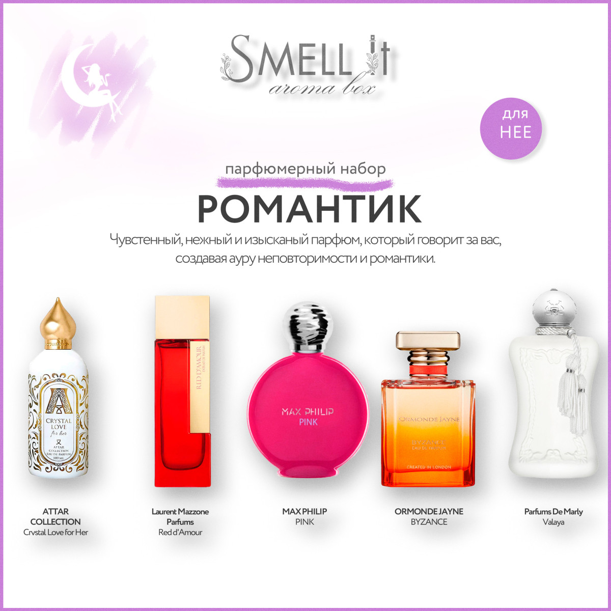 Погружение в Атмосферу Любви: специально подобранные ароматы нашего "Романтичного" аромабокса созданы, чтобы пробудить сердце и душу, окутав вас и вашего партнёра аурой нежности и страсти. Каждый флакон – это ключ к воспоминаниям о первых свиданиях, бесконечных прогулках под звёздами и тихому шёпоту при свете свечей.